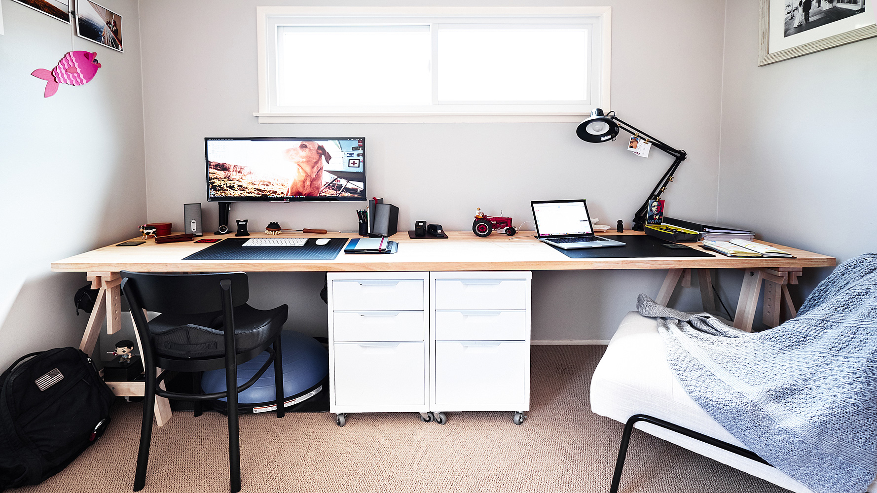 We set that upon tressel legs from IKEA. Files cabinets from CB2. Mounted the LG 34in Ultrawide on an arm. Really love the light and new space. It really forces us not to accumlate too much junk!
